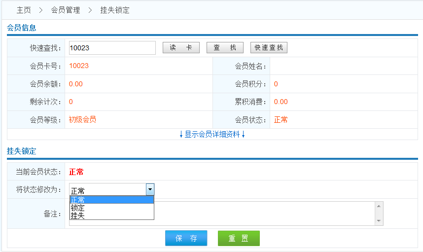 將狀態修改為:有三種可供選擇的狀態 正常 掛失 鎖定
